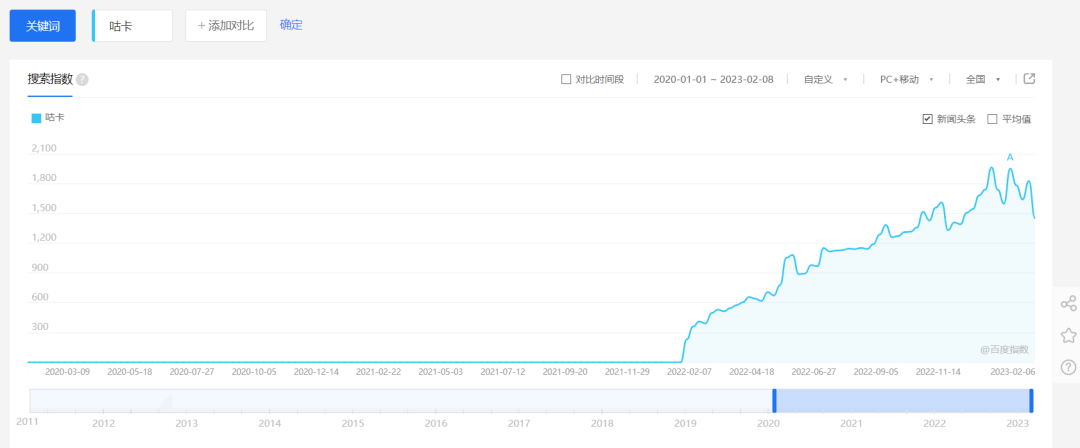 百度搜索指数显示,在2022年之前,关于“咕卡”的搜索指数为0,2022年“咕卡”的搜索指数呈波动上升趋势,并在年末达到顶峰,2023年年初再次迎来小高峰。