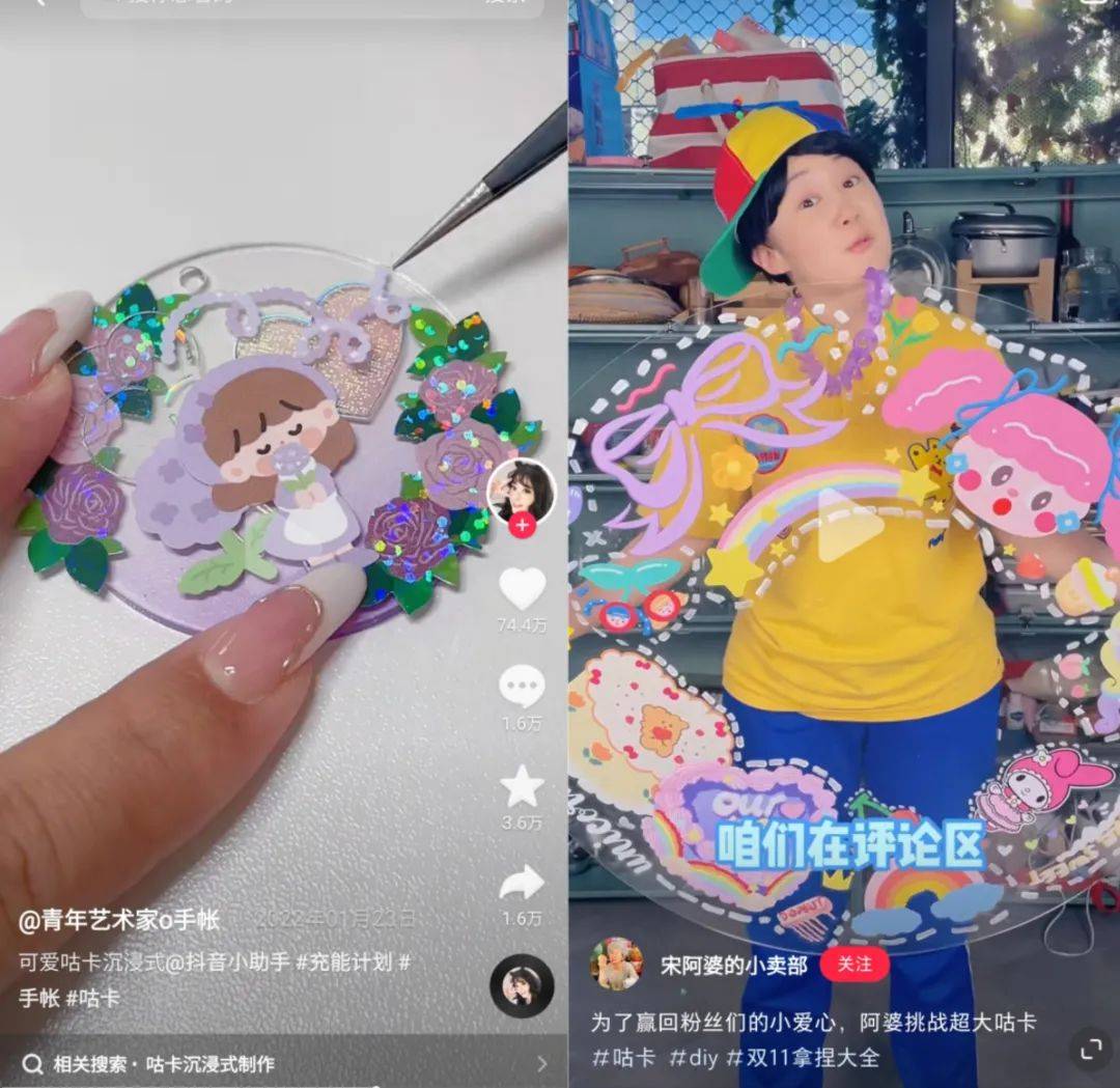 比如抖音粉丝482万的“青年艺术家o手账”发布多条“沉浸式咕卡”视频,单条最高获赞超74万;小红书博主“宋阿婆的小卖部”做了半人高的Plus版“咕卡”,互动量破30万。