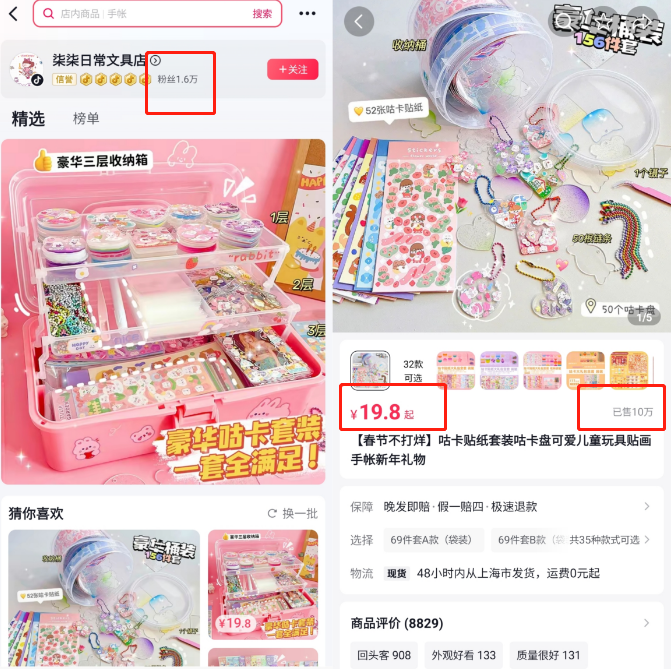 比如抖音粉丝量仅1.6万的“柒柒日常文具店”,一款19.8元起的咕卡套装卖出10万份,预估销售额超200万元。