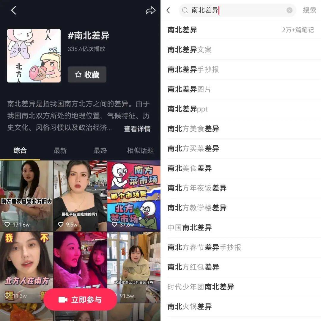 抖音上,相关的“#南北差异”话题播放量就达到336.4亿次;小红书上,有关南北差异的笔记有2万多条,不少相关笔记的点赞突破了10万;微博上,也有着“南北方过年的差异”“压岁钱的南北差异”等相关热搜。