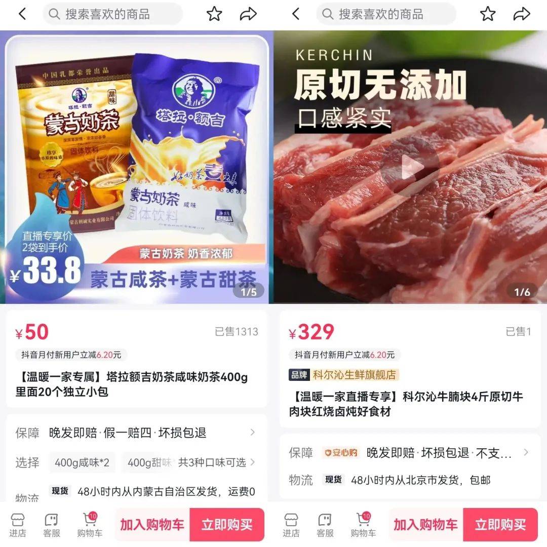 蝉妈妈数据显示,近180天,温暖一家一共开播29场,日均销售额在100万—250万元,总销售额在2500万—5000万元。最近的12月29日直播带货中,40个商品有37个商品为生鲜蔬果和食品饮料,带有内蒙古和东北标签的商品就有18个——老丈人的内蒙古东部和东北人设,会让这些商品更有说服力。