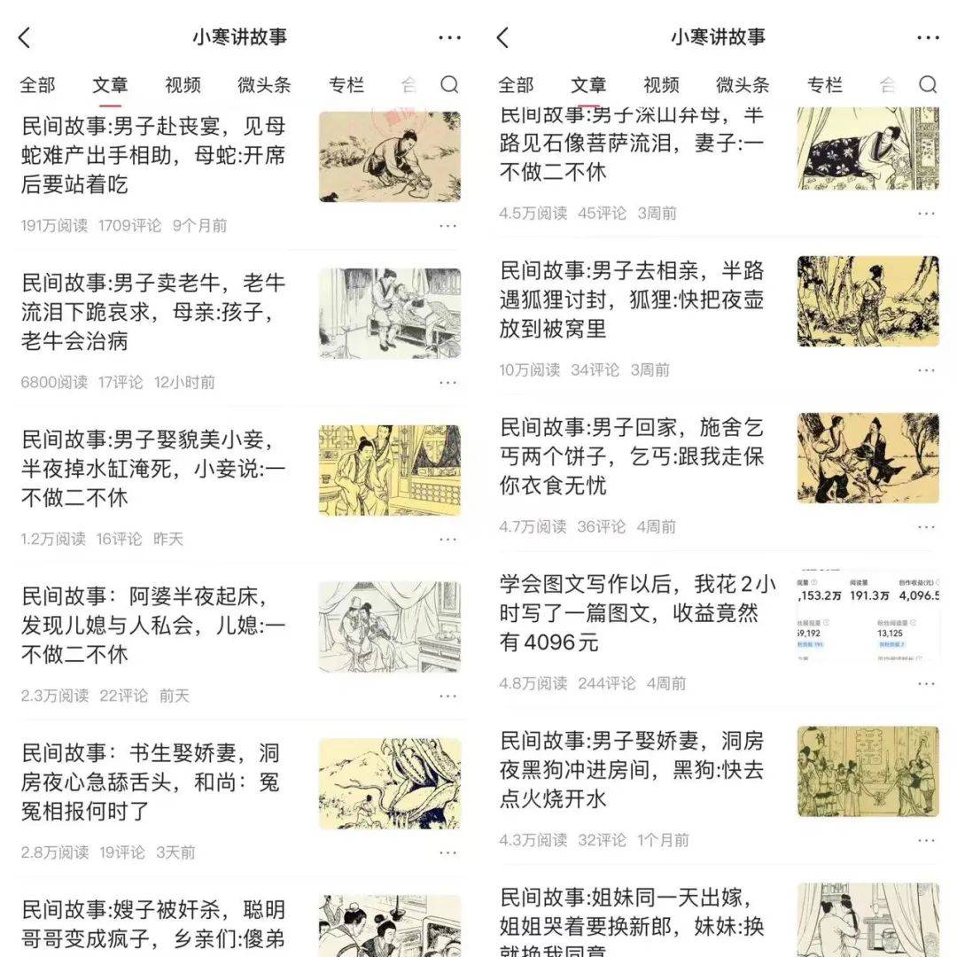 比如【小寒讲故事】这个账号,现在以文章分享故事为主,许多内容单篇阅读量都有五六万,这种账号只要持续写,每个月再少四五千收入总是有的。