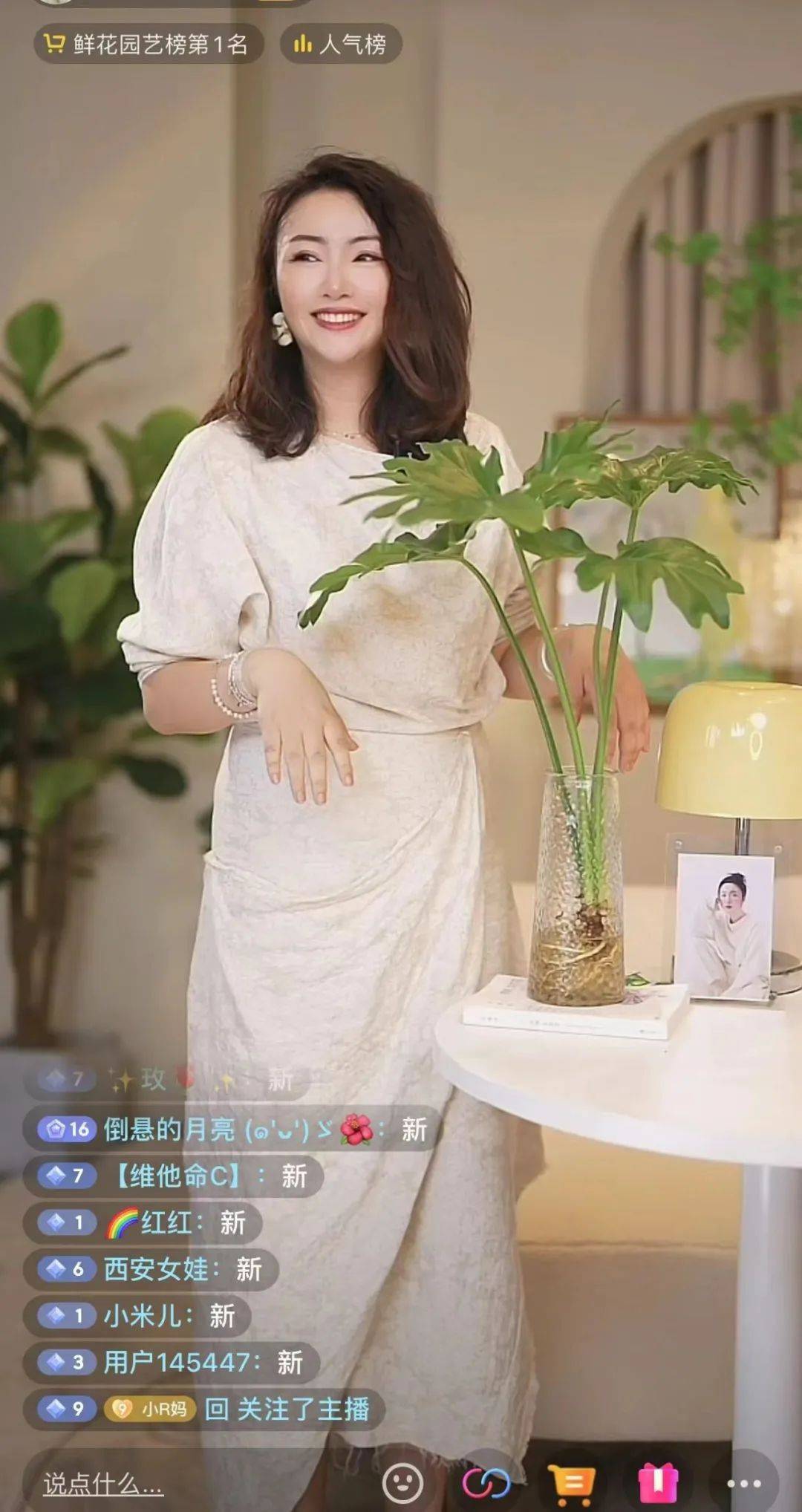 点开苏苏的直播间,仿佛进入了一个可以让人充分放松身心的疗愈空间。屏幕里的这位主播,身着一身白色长裙,妆容精致,面前摆着一盆半人高的水培植物,不疾不徐地向大家讲着: