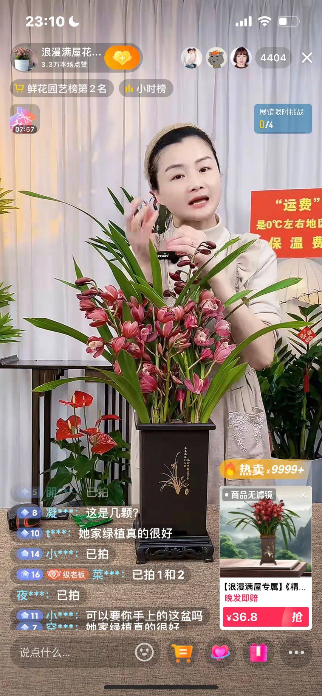 等到4月中旬,成云感觉自己找到状态了,流量也慢慢好了起来。第一次卖金钱树的时候转化特别好,在线人数8000转化了2000多单,一场就成交了十几万元。去年底卖兰花,她不到三小时就成交了4万单。