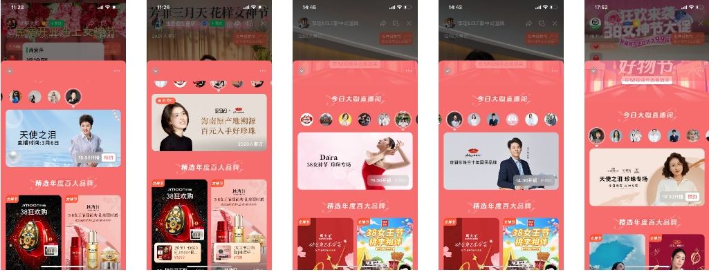 在3.8节等重要营销节点上,京润珍珠会邀请一些达人做大场直播,在这些时段,达人带货占比会高于品牌自播。但在大多数时间里,京润珍珠更专注品牌自播。从女神节大咖直播间来看,京润珍珠就出现在了达人【困困妈】、【十点读书雅君】、【央英蒋老师教唱歌】等直播间,且都是以专场直播的形式进行合作。