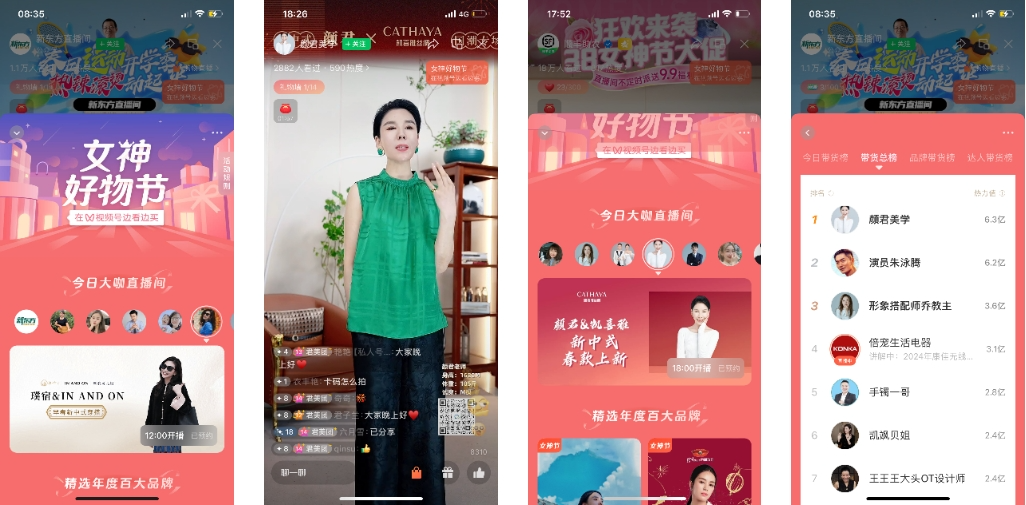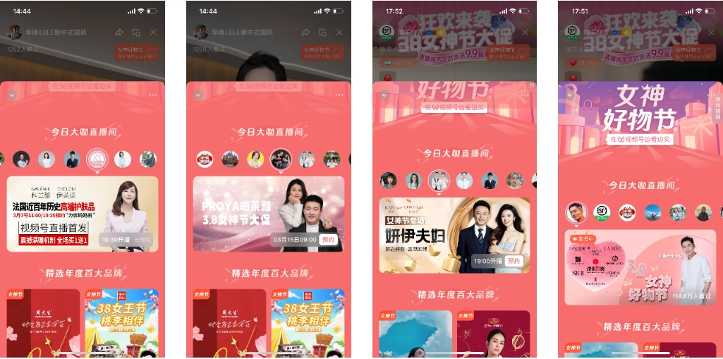 此次3.8女神节期间,视频号女神节直播大促激励计划也推出了女神节专属的活动页面,分为四个部分:今日大咖直播间、精选年度百搭品牌直播间、3.8女神节带货榜单和更多直播间推荐。