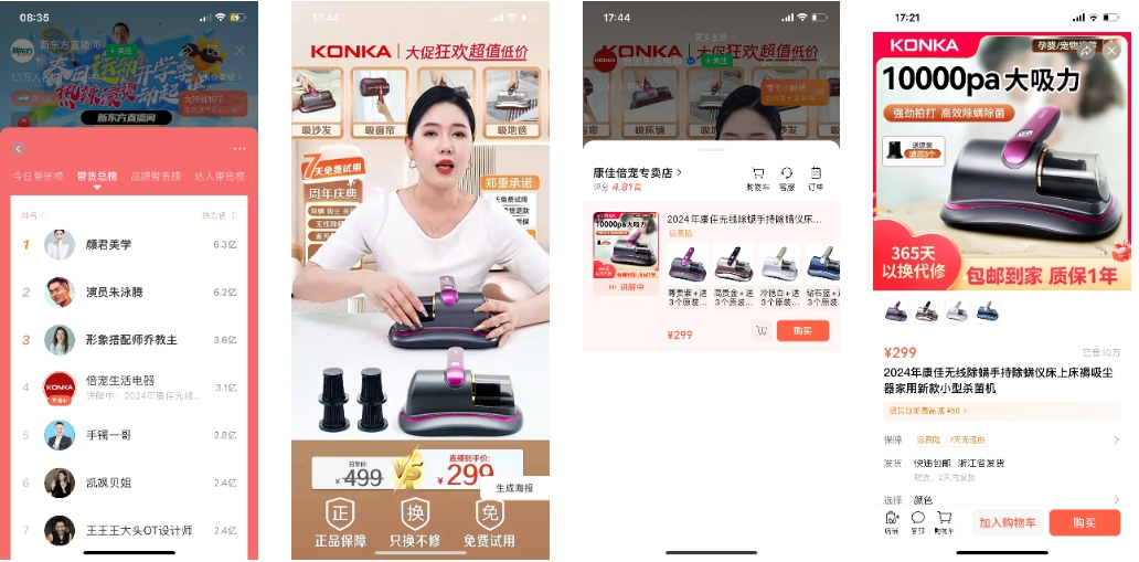 点进直播间,发现【倍宠生活电器】主推的只有一款产品,那就是标价为299元的除螨仪,能靠着这一款产品冲进女神好物节带货总榜前面,这就足以说明产品选择的重要性。我们发现,点击该产品的详情页,产品的销售数据显示已售数量超过10万+。