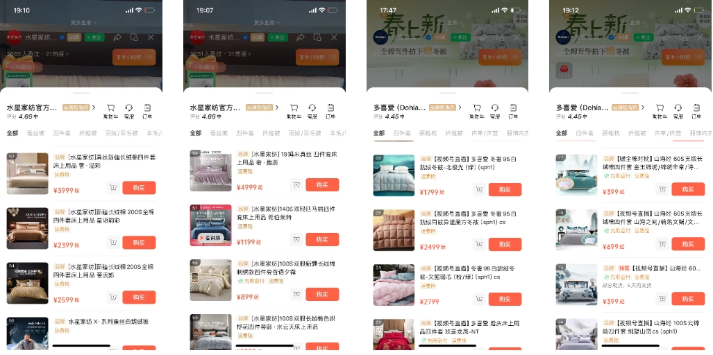 除了【倍宠生活电器】之外,还有一个上榜的直播间也透露出了女神节姐姐们的消费习惯,它就是【多喜爱官方商城】,直播间挂车的主要是床上用品。除了多喜爱之外,在视频号女神好物节年度百大品牌直播间,同类型的直播间还有水星家纺、梦洁家纺等。