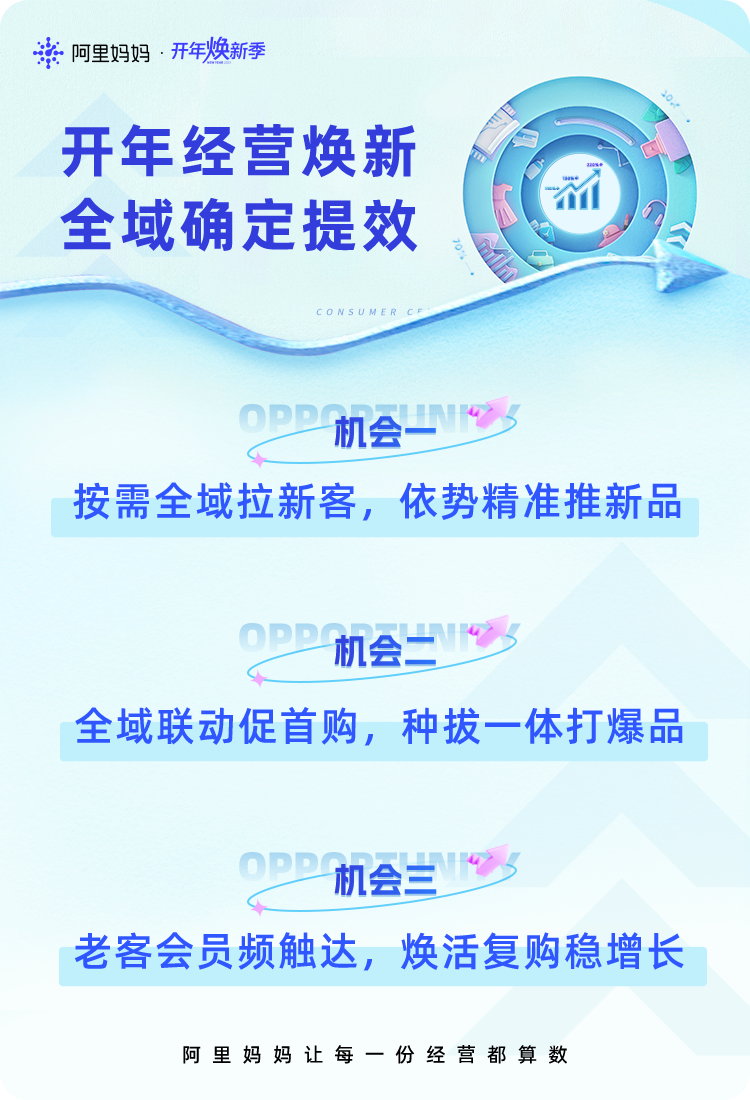在消费焕活的2023年,品牌要从全域有效获客、精准上新、会员焕活等等多个维度焕新经营策略,实现全域经营确定提效,而这离不开阿里妈妈数智能化能力的应用及策略配合。