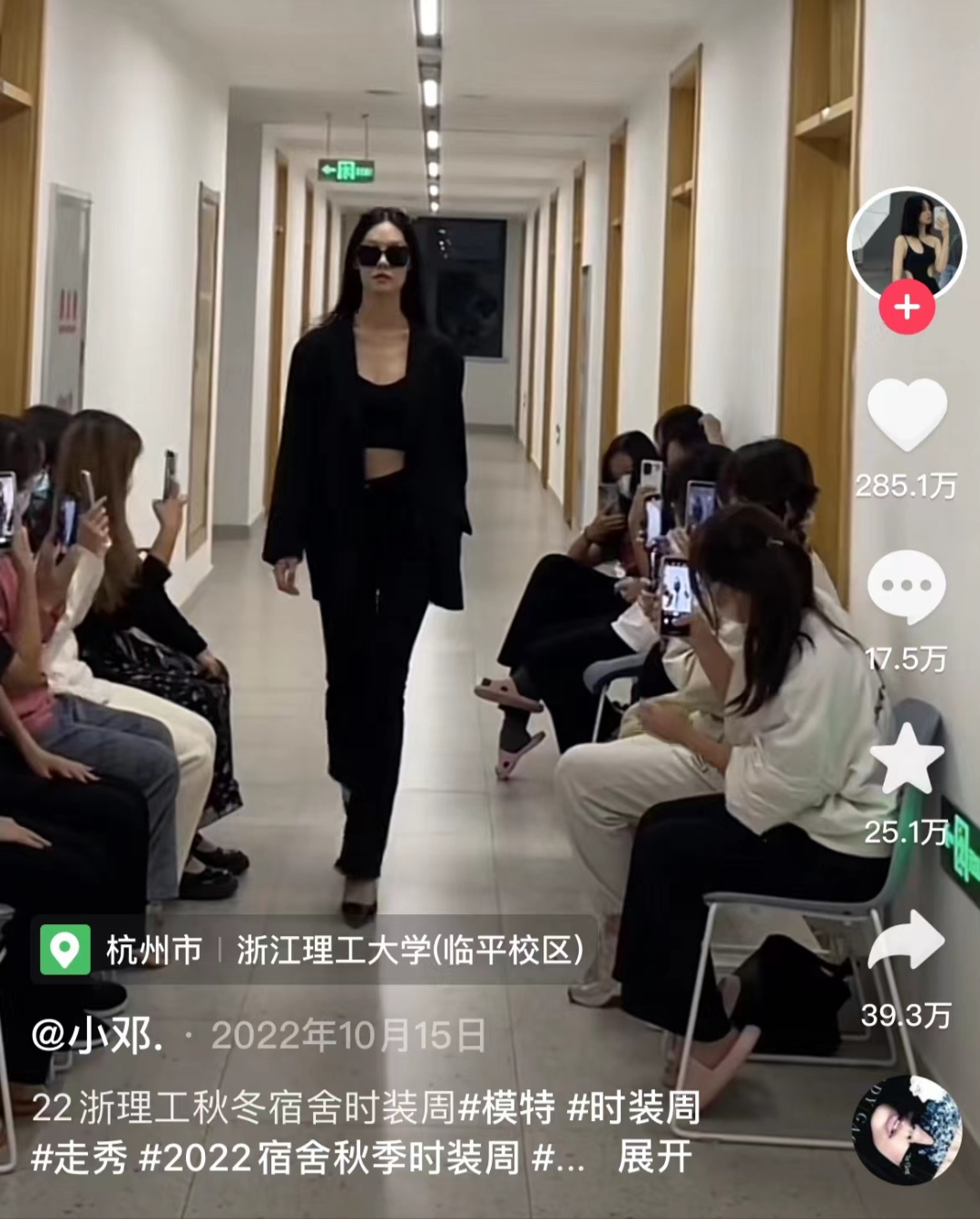 临平校区的女学生,在去年的秋冬宿舍时装秀爆火出圈,一个个走出了人在宿舍、心在巴黎的既视感,带动了一波模仿潮。