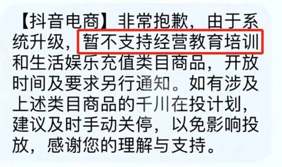 此外,采取同类措施的还有抖音的投流平台千川,有知识类博主就收到了一条停止经营教育培训和生活娱乐充值类目投流的通知短信。