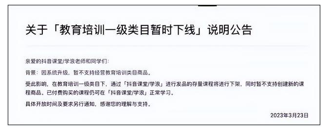 按照公告来看,在教育培训一级类目下,通过抖音课堂和学浪进行发品的存量课程将进行下架,同时暂不支持创建新的课程商品。