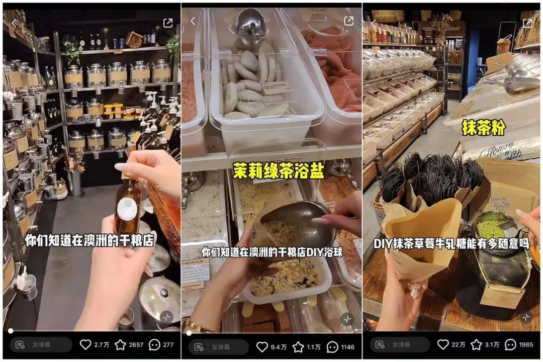 自此,“干粮店”成为@在悉尼吃喝玩乐的KK 作品中存在感最高的地方,几乎每条视频的开头都变成了“你们知道在澳洲的干粮店,做XX有多随意吗”。接着镜头就会转向博主在干粮店里打包各式各样原材料时的状态,这些未来都会被她拿回家DIY一些美食和用品。