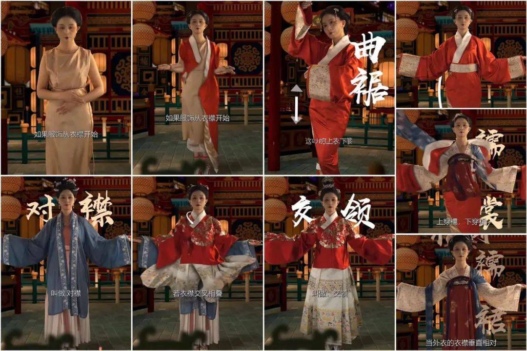 以其数据最好的汉服篇举例,出镜人一开始穿着素衣站在一个古色古香的背景下“待机“,下一秒,一袭红色曲裾就”主动“缠绕到了出镜人身上,简单讲解了一下曲裾的特色后,一身襦裙又“凭空出现“,出镜人一步未动,但已经又换上一身新装。