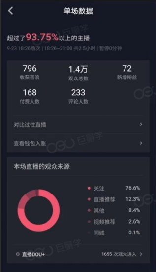直播推荐导流到直播间的流量/今日播放量:364/119391=0.42%