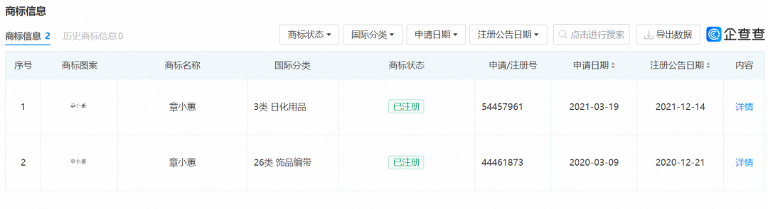 通过查询章小蕙微信公众号认证的北京风荷举文化传播有限公司可以发现,公司在2020年就已经注册了“章小蕙”商标,涉及饰品编带和日化用品两个品类,章小蕙在之后还可能推出个人品牌,继续用名媛的身份为自己带货。