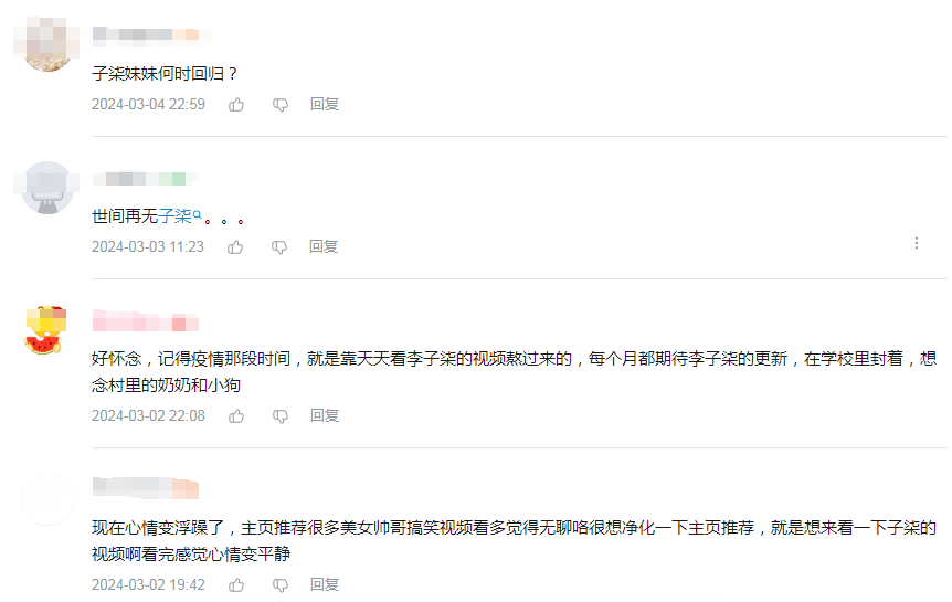 不少粉丝都流露出“许久未见”的欢喜,对李子柒的回归又重燃了希望。