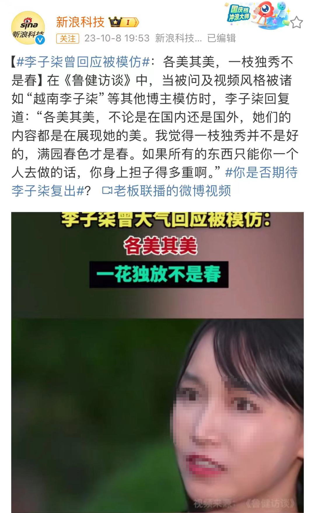 在2021年的《鲁健访谈》中,李子柒曾大气回应被模仿,“各美其美,不论是在国内还是国外,她们的内容都是在展现她的美。我觉得一枝独秀并不是好的,满园春色才是春”。