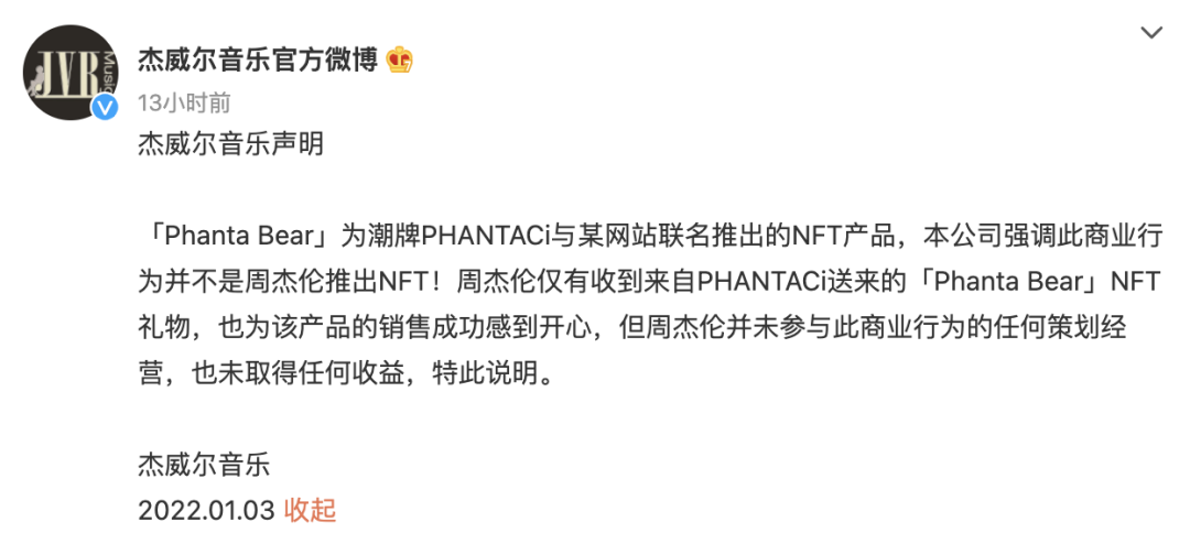 幻象熊由周杰伦和好友Ric Chiang创办的潮牌PHANTACi推出,在周杰伦的宣传造势下,10000枚幻象熊NFT不到40分钟就售罄,售出估值也达到了6200万元人民币。收益比发行新歌还赚钱,让周杰伦背后的杰威尔音乐不得不紧急辟谣:周杰伦仅仅是收到了品牌赠送的礼物,从未参与该项目的任何策划经营,也未取得任何收益。