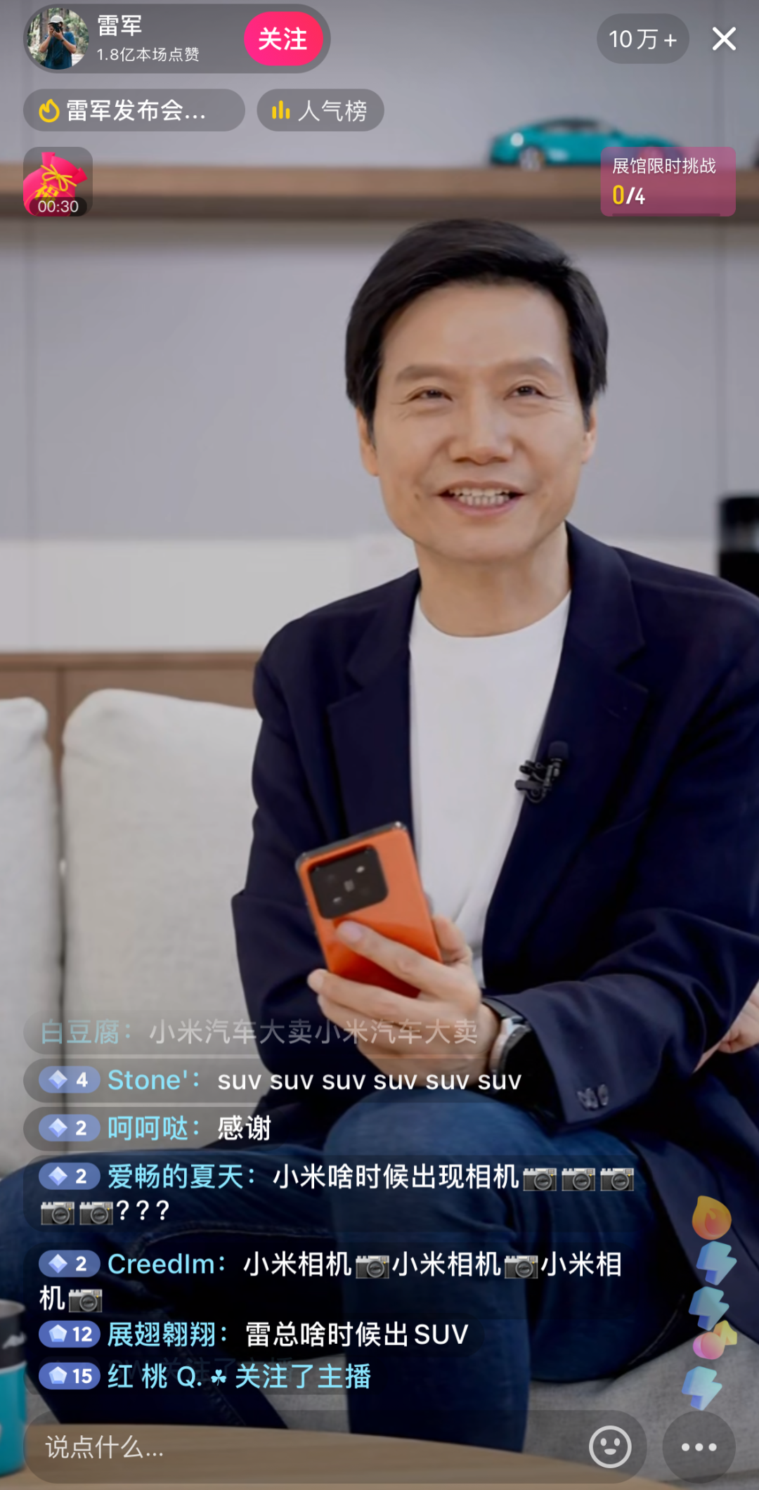 今天(4月18号)下午4点,雷军在个人抖音账号上开直播,跟大家好好聊聊发布以来关于小米SU7他“万万没想到”的二三事,还为网友准备了一点小礼物(马克杯和车模,直播每分钟送一件)。