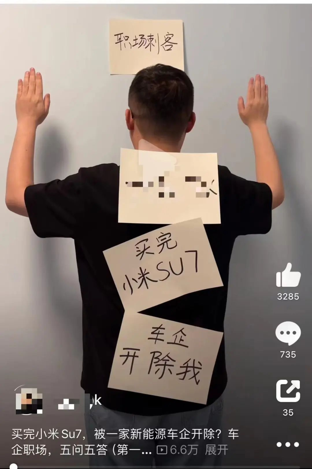 4月15日,该网友在抖音平台上发布视频,声称自己在购买小米SU75天后就被所在的新能源车企开除,且没有赔偿金。