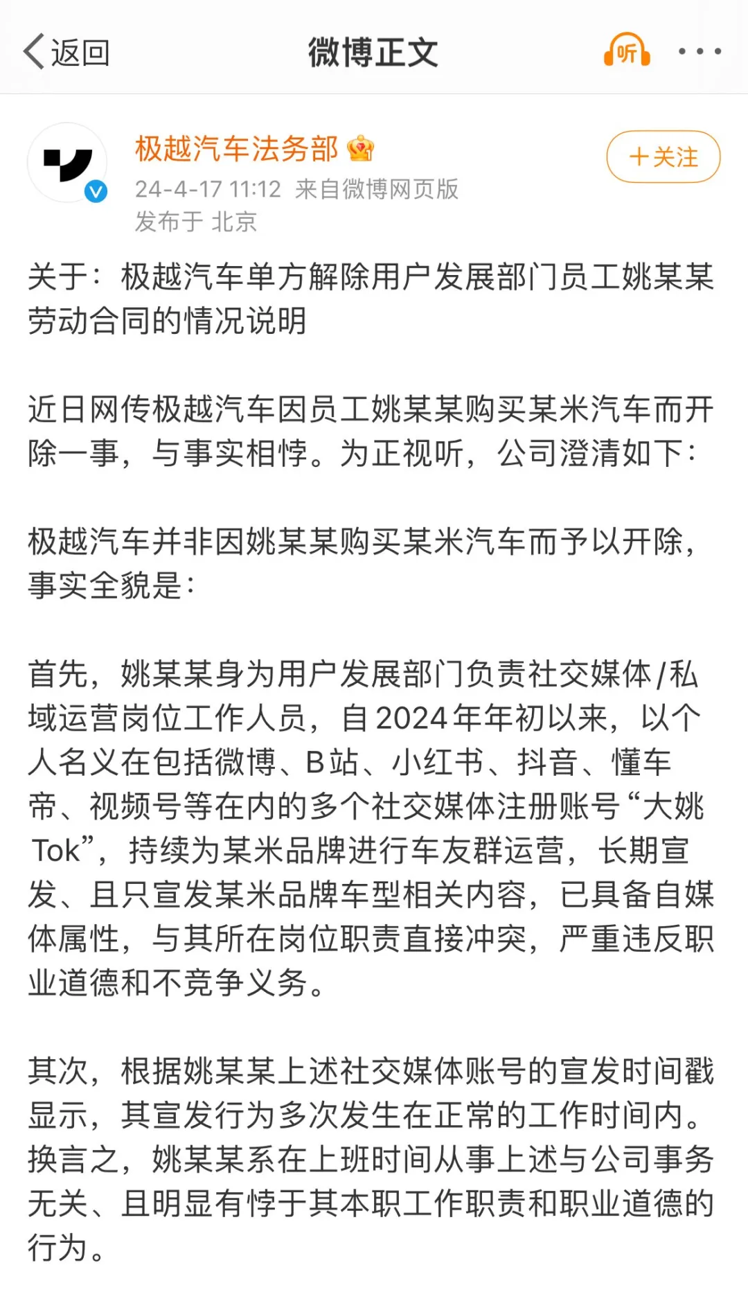 在昨日中午(4月17日),极越汽车法务部给出了情况说明,把单方面解除该名员工的原因都一一列出来了。辟谣极越汽车并非因姚某某购买某米汽车而予以开除。