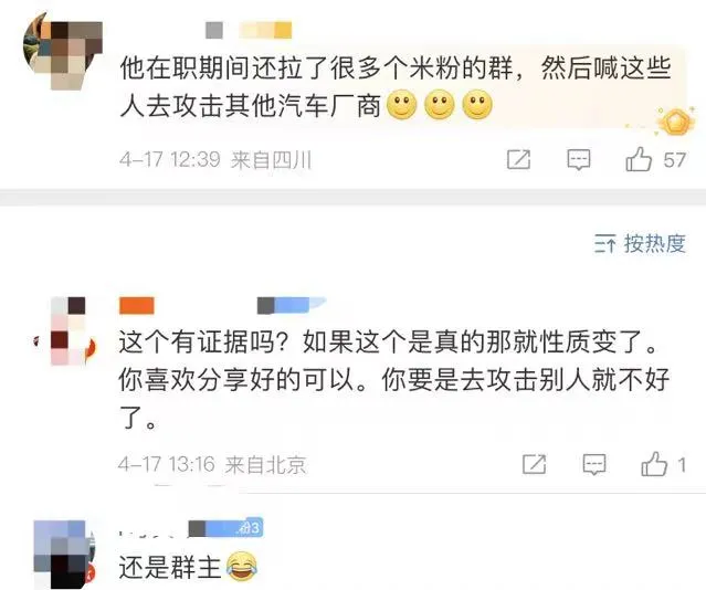 更有网友爆料,称这位博主在职期间还拉了很多个米粉群,号召人们去攻击其他汽车厂商。
