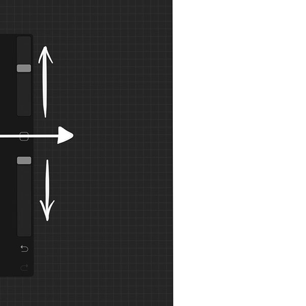 侧边栏可以快速调节当前所用画笔:上半部分的滑条调整当前画笔尺寸、下半部分改变画笔的透明度、中间的矩形默认可以用于打开取色器,你也可以在偏好设置中将其改为别的快捷按钮。侧边栏最下面的是撤销和重做按钮,按住撤销按钮会启用「快速撤销」——自动执行多次撤销操作。