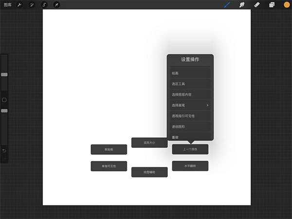 其中「速选菜单(QuickMenu)」是一个重要的工具,默认是没有触发方式的,你需要自己分配一个手势启用它,比如这里我选择的是三指向下滑动来触发。「速选菜单」中有六个选单,长按其中一个选单即可自定义内容,根据习惯的不同你可以将之用于快速切换常用画笔或者是作为常用功能的快捷唤出方式,这对减少繁琐操作很有帮助。