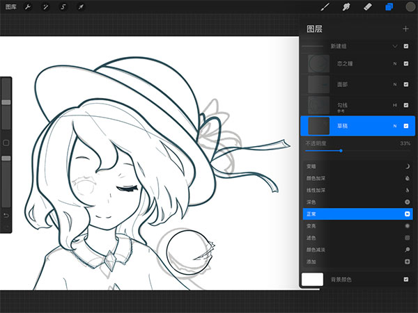 顺便一提这里的「N」指的是当前图层的混合模式为「正常(Normal)」,我有时会将勾线用的图层改为「强光(Hard Light)」好让底稿线条在勾线中可见。在图层编辑菜单中你可以改变当前所选涂图层的混合模式,这些选项和你在许多专业图片处理软件中所见过的图层特效基本一致,如果你想要更详细地了解这些混合模式选项的具体含义,你可以参考 Procreate 官方文档 对「混合模式(Blend Mode)」的解释。