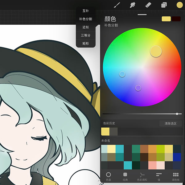 勾线完成后,就可以开始构思初步的配色方案了。在你的配色方案中使用补色来调整配色方案经常能让画面色彩更加协调和平衡,而 5.0 版本更新后色盘中增加的「颜色调和」就是配色时一个非常实用的工具,你可以通过它快速查找某一个颜色的补色、近似色。