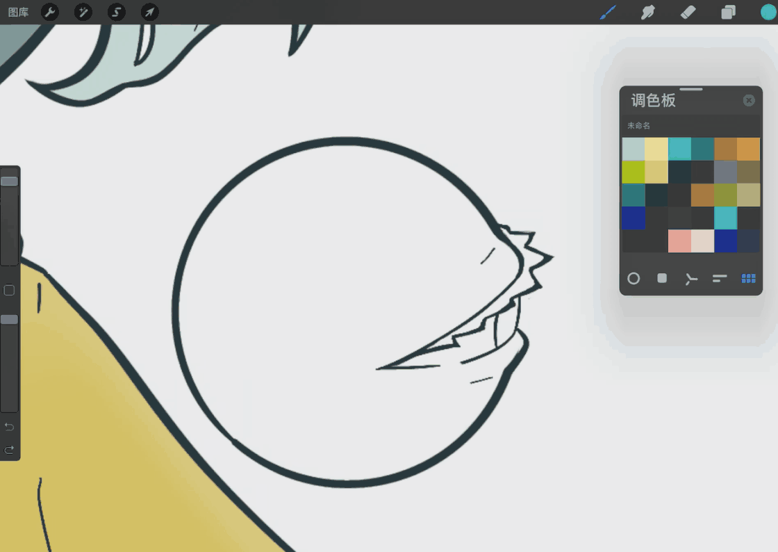 填色阶段,你将用到的一个比较隐藏的功能:「色彩快填(ColorDrop)」。你可能已经意识到了,你没有在 Procreate 中见到类似油漆桶工具的按钮,其实这个叫「色彩快填」的工具是藏在色盘按钮里了。