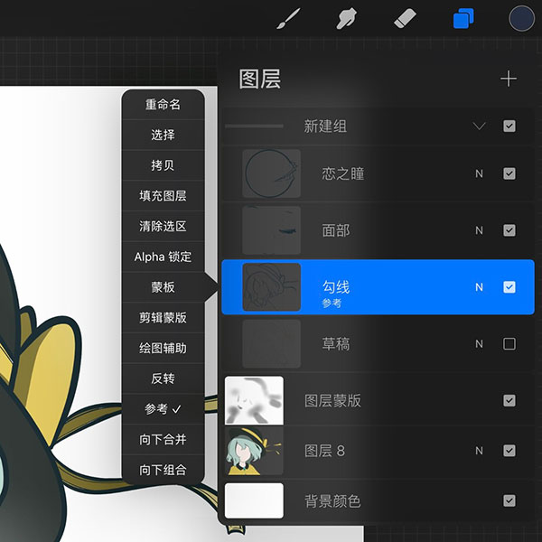 但是如果你在一些有着复杂图层关系的绘画中使用「色彩快填」很可能会屡屡受挫,毕竟这个功能正常是不能跨图层识别画笔边缘的。这时你需要的是点击当前所选图层选项,弹出图层的操作菜单,打开「参考」。打开「参考」的图层能够在任何其他图层中依然被「色彩快填」识别边缘并填色,在画漫画和大色块风格的作品中这项功能相当实用。