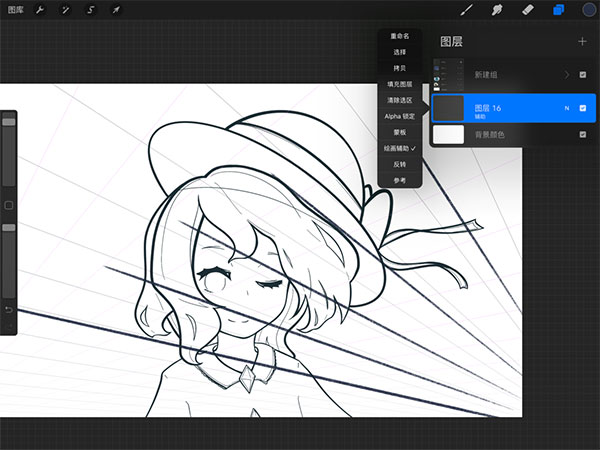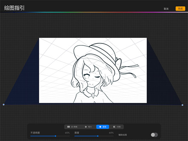 「绘图指引」能够设置成多种不同形式的辅助线网线,除了普通的平行网格外,还有等边三角型格线、透视线、对称轴线。在图层操作菜单中开启「绘图辅助」后,在该图层绘图时画笔的走向会自动按照网格方向进行。