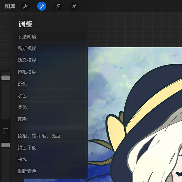 Procreate 的界面布置相当简洁,顶栏的内容被分成了左右两个区域,各分配给左右手五个不同的功能按钮,而除了顶栏以外就只有一个简单的侧边栏。