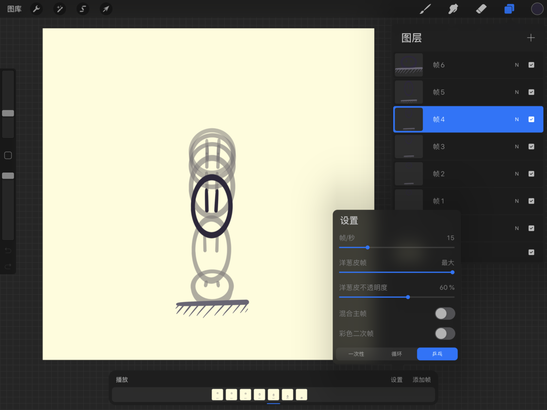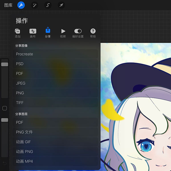 你可能注意到导出选项还有几项分享为动画的选项,其实这是上个版本中所添加的动画输出工具,当用这种方式导出时,Procreate 会以每个图层为一帧画面输出动画。在 5.0 更新后,这项辅助绘制短动画的功能得到了进一步的拓展。