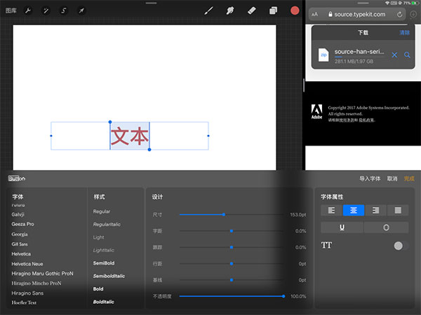 Procreate 有相当完整的字体支持。你可以在「操作 - 添加 - 添加文本」中选择添加矢量的文本图层。托 iOS 13 / iPadOS 中 Safari 浏览器新增了下载管理器的福,你可以很轻松地在网站中批量下载字体并导入 Procreate.