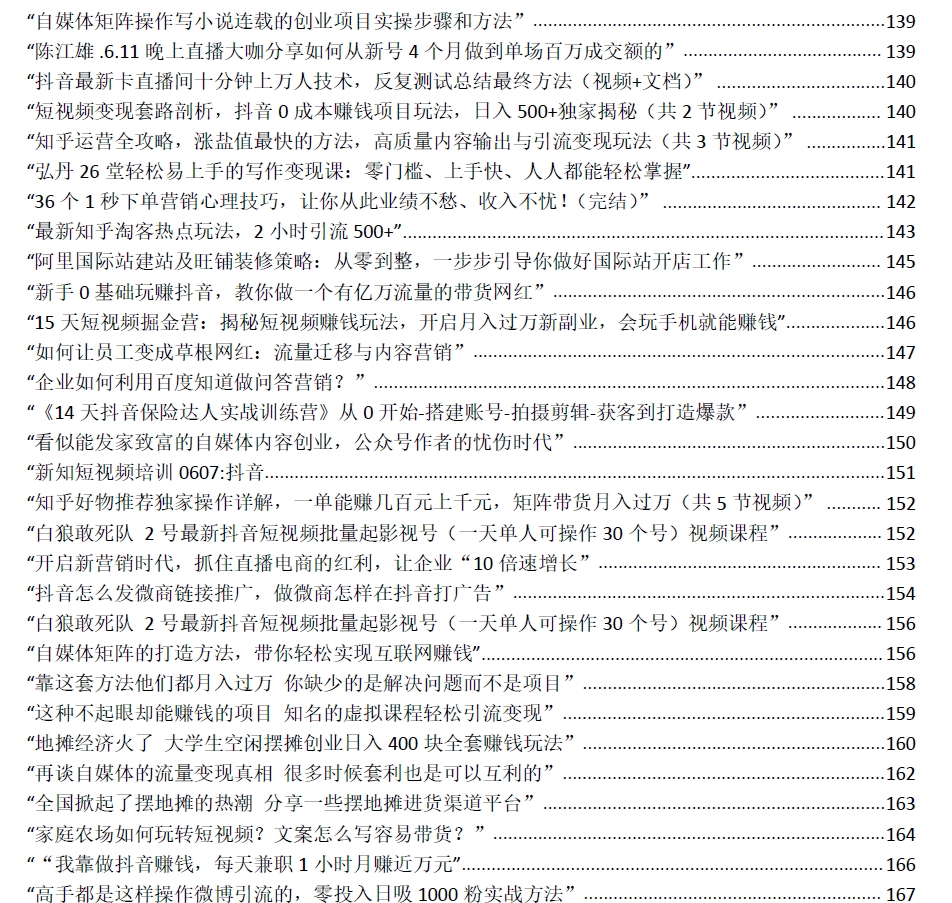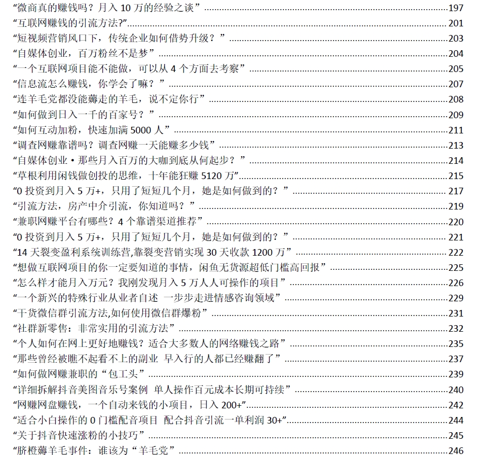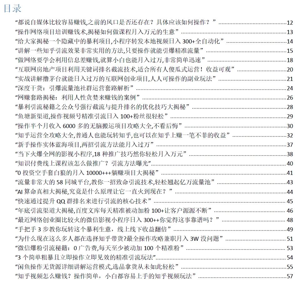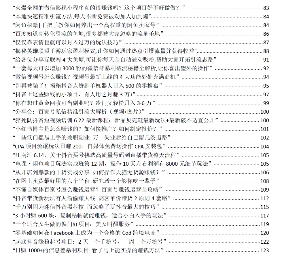 这是一本非常有研究价值的网赚资料PDF书籍,本质上这不是一本正儿八经的书,它是收集的2023年那些超级热点的以及很多人实践过的网络赚钱案例和经验集,比如自媒体赚钱、视频媒体赚钱、开网店赚钱、打造鱼塘赚钱、闲鱼空手套白狼、直播赚钱等等,基本上网络上的赚钱招数这里都有一定记录,这都是一些实践人士分享的。