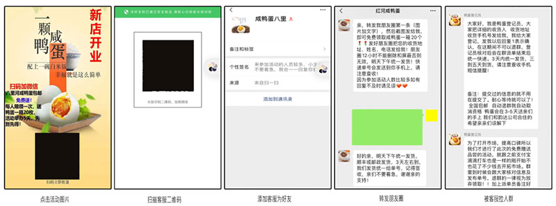 这些内容单独来看并没有什么,然而组合在一起来看,就封装成了一个自圆其说的、完美且看似真实的新店开业促销故事,极易迷惑性。且能在用户心底种下了一个“信任”的种子,为后续该团伙在刷单营销时,做了很好的心理铺垫(至少大家不那么反感,毕竟他说会给大家送20个咸鸭蛋)。