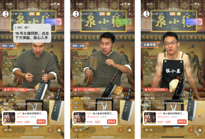 以上,关于「张小泉刀具旗舰店」直播间的人货场打法亮点就拆解完了。通过观察张小泉在抖音上的官方直播间,我们发现,在抖音上,张小泉并没有采取知识带货这一策略,而且抖音直播间出镜的主播也更多是女性主播。