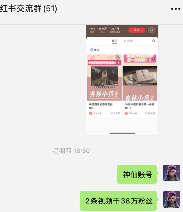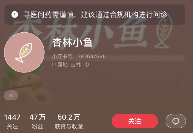 但是她从一开始就明确自己 IP 应该叫啥,这是值得模仿的。头像是一条鱼,昵称、背景都是「杏林小鱼」。不一定跟行业相关,但一定是明确你是谁(小鱼),具有 IP 识别度