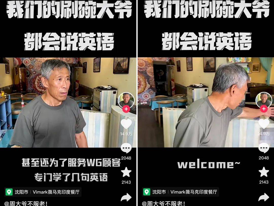 据观测,早在2020年6月中旬,@周大爷不服老 !就开始在抖音上发布作品,但早期的主人公并不是周大爷,而是着重介绍一个印度餐厅的菜品和环境。直到2020年9月15日,原本在后厨刷碗的周大爷因为服务员的突然离职而被迫上岗,干活利索的他专门为接待外国顾客学了几句英语,一句带着口音的welcome瞬间引爆流量,为账号引来了前所未有的关注。