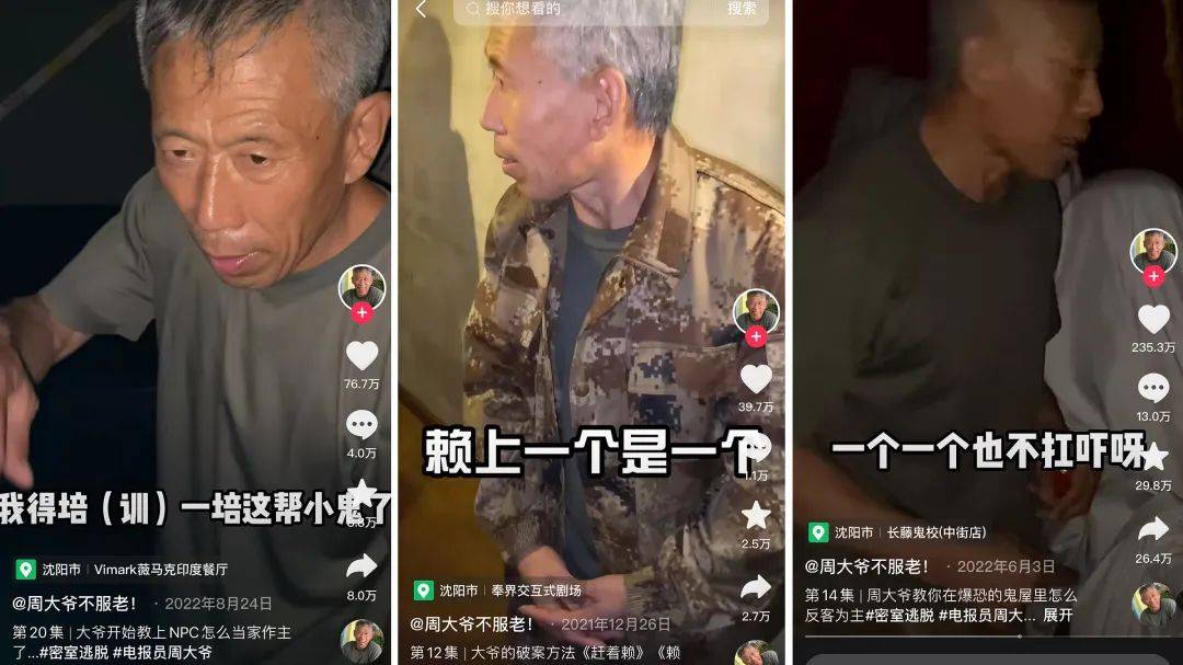 一众挑战活动中,密室逃脱系列内容尤其受到用户的喜爱。在密室中行走的周大爷,不仅背着手,整出了在家遛弯的架势,丝毫不惧各路NPC,甚至还反客为主,一边吓起了NPC,一边给NPC做起了培训、指导他们如何当家做主。自信胆大的大爷加上反转+反差的故事走向,让用户看得不亦乐乎。