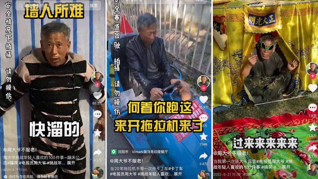 @周大爷不服老!,目前的抖音粉丝量已经突破了1200W。正如其账号名字所显示的那样,不服老的周大爷在视频中主打尝试各种年轻人喜欢的事物,反差感被狠狠拉满。