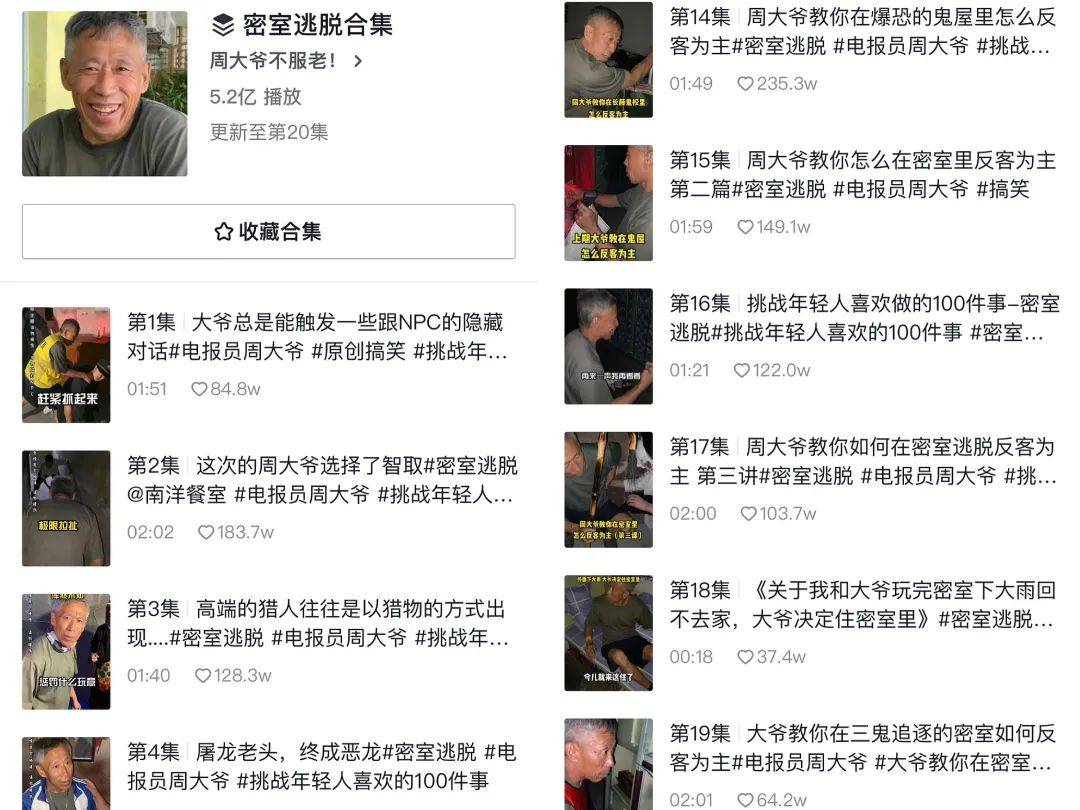 截至目前,密室逃脱已经更新了20集短视频,播放量已达5.2亿,且点赞在百万以上的视频占比将近一半,用户对该主题的喜爱程度可见一斑。