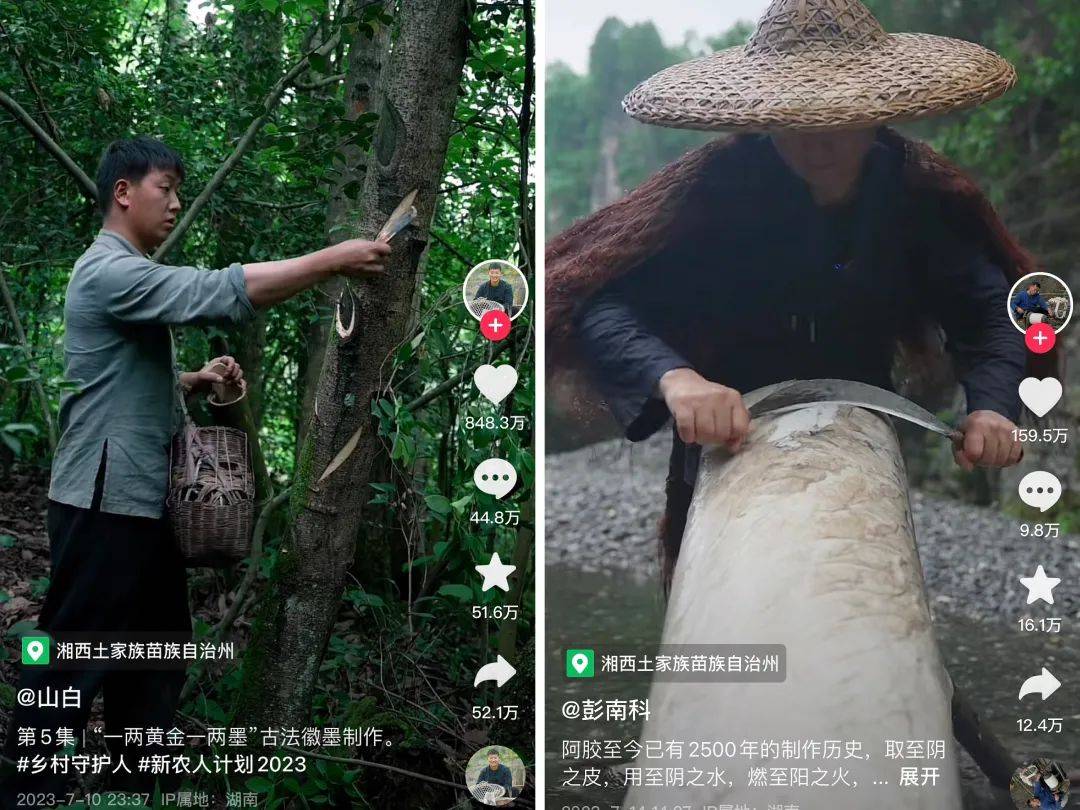 典型的如@山白和@彭南科,二人都是传承非遗文化的守艺人,会在视频中“复刻”各种传统物件。比如@彭南科 曾在抖音中陆续发布过古代化妆品、古代农具、笔墨纸砚等系列视频,@山白则用时两年用古法制作徽墨、制作过油纸伞、竹纸、毛笔……他们不仅一一展现了这些传统物件的制作过程,视频风格也清新而质朴,有着浓浓的中国传统意蕴,很容易让用户沉浸其中,深度感受传统文化的魅力。