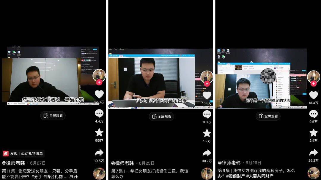 虽然今年4月份才开始在抖音上发布作品,但@律师老韩 最近却在抖音上收获了如潮热度。