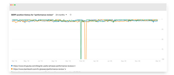 “绩效审核”这个关键词的搜索结果保持了24个月不变,只是在2020年2月短暂洗牌后才恢复原状。