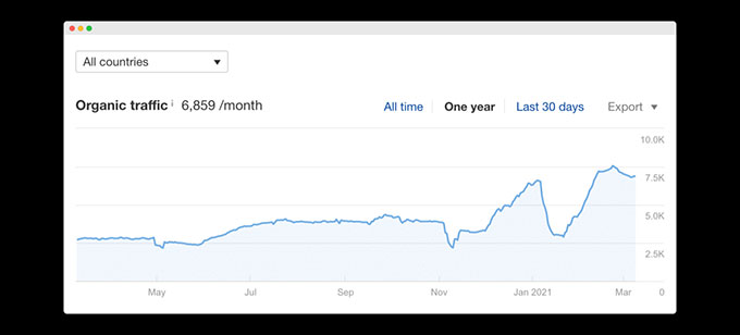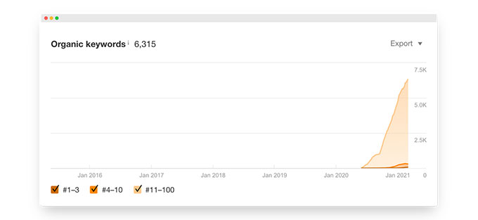 通过这种缓慢而稳定的建立关键字排名的方法,增长最初是渐进式的,然后达到一个拐点,自然流量开始复合,如图所示,到 2020 年底: