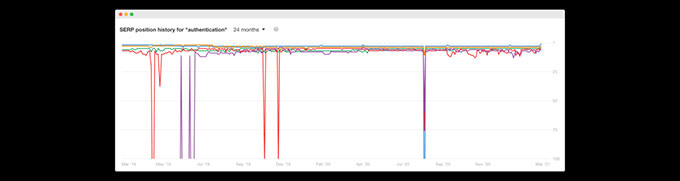 垂直的混合波动反映在过去两年主要术语“身份验证”的头寸历史中。老牌玩家争夺位置,但没有新网站闯入 SERP: